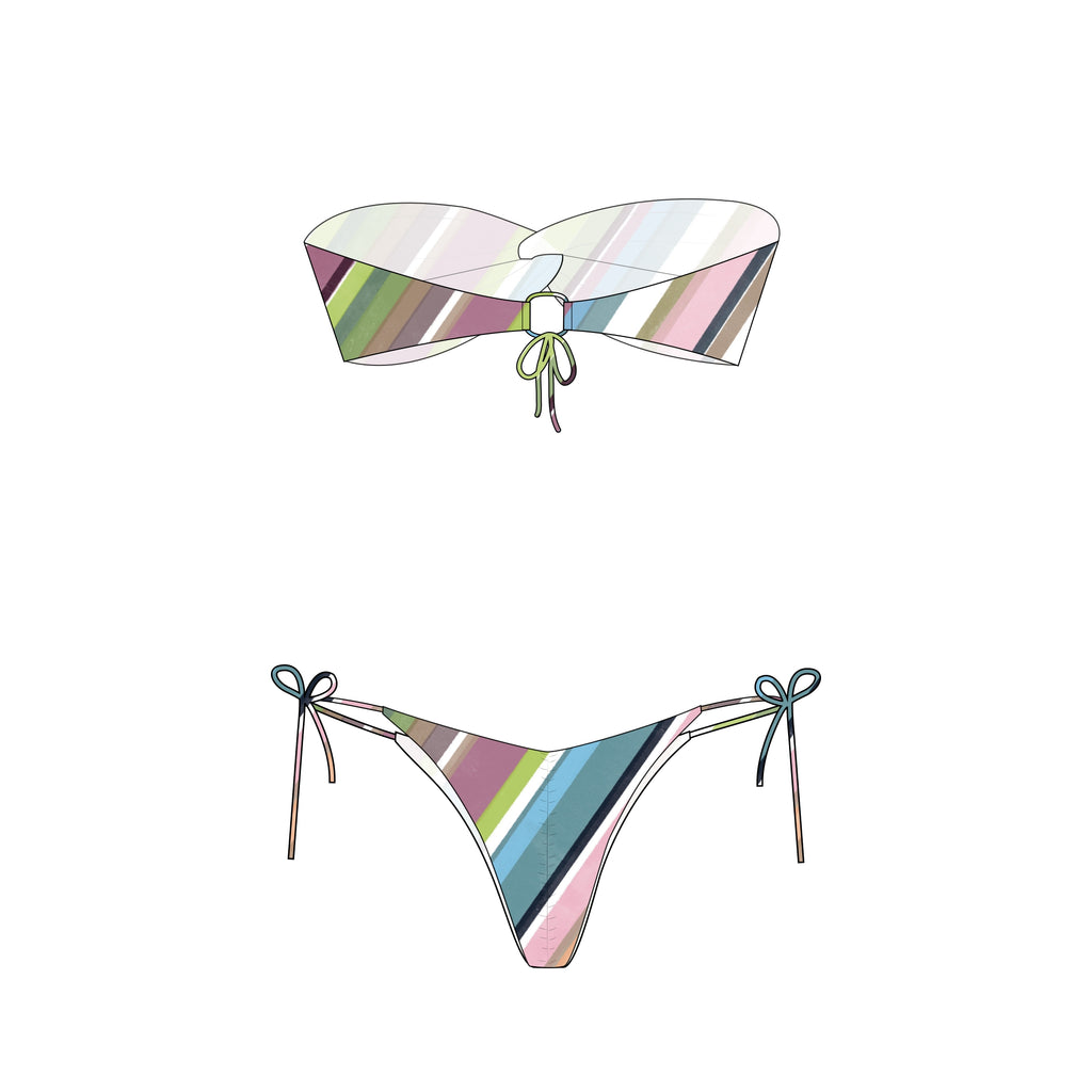 Estilo versátil con un toque playful. Nuestro bikini de rayas combina un strapless drapeado con amarre ajustable en espalda y un bottom de tiras laterales con detalle fruncido en la parte posterior, creando un look favorecedor y cómodo. Cada pieza está pensada para que personalices tu fit y disfrutes de un diseño único que realza tu figura.